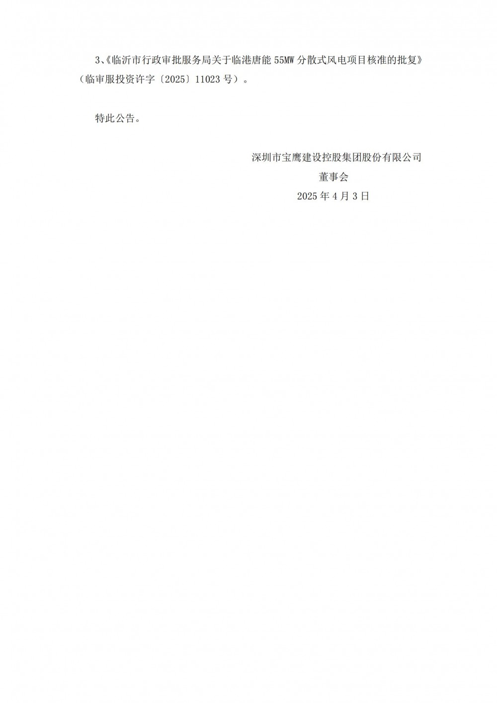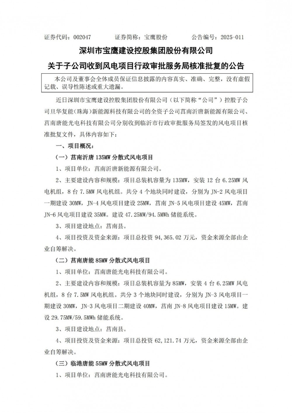 公告顯示,近日深圳市寶鷹建設(shè)控股集團(tuán)股份有限公司控股子公司旦華復(fù)能(珠海)新能源科技有限公司的全資子公司莒南沂唐新能源有限公司、莒南唐能光電科技有限公司分別收到臨沂市行政審批服務(wù)局簽發(fā)的風(fēng)電項(xiàng)目核準(zhǔn)批復(fù)文件??傆?jì)3個(gè)風(fēng)電項(xiàng)目、裝機(jī)容量275MW,配儲(chǔ)規(guī)模為96.25MW/192.5MWh,總投資金額合計(jì)201,678.53萬(wàn)元。
