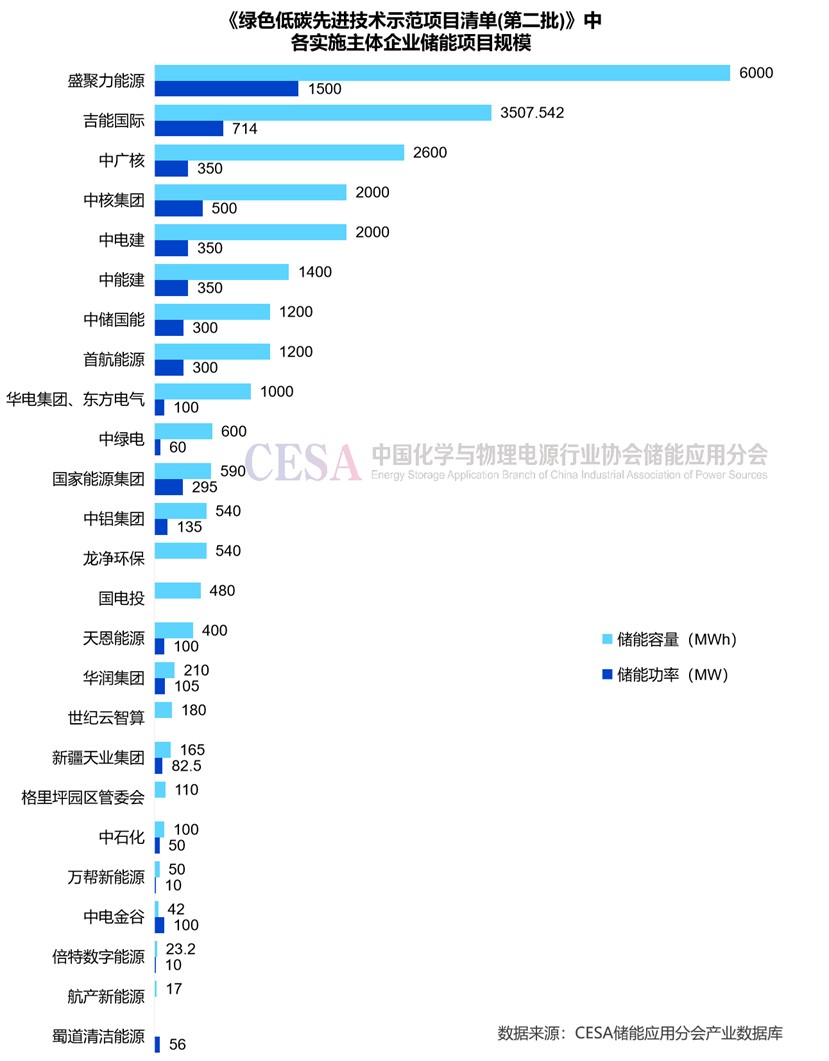 《綠色低碳先進技術示范項目清單(第二批)》(公開征求意見稿)中儲能項目的實施主體包括盛聚力能源、吉能國際、中廣核、中核集團、中電建、中能建、中儲國能、首航能源、華電集團、東方電氣,這些主體建設的儲能規(guī)模均在1GWh以上。