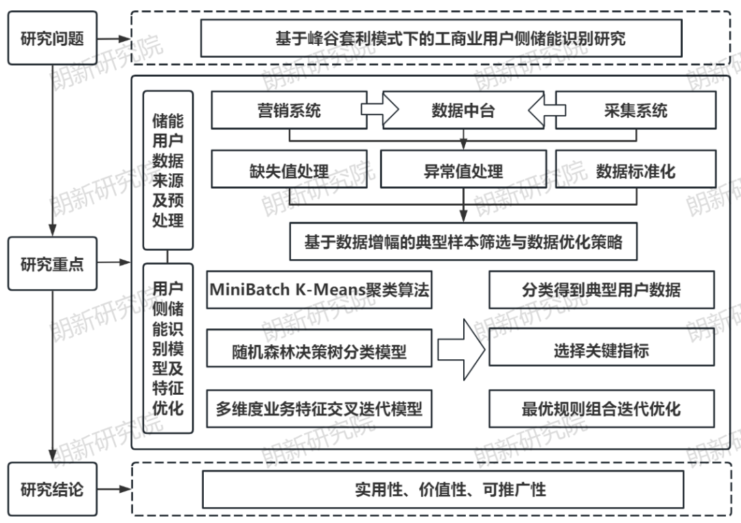 本文以識別峰谷套利模式下的工商業(yè)用戶側(cè)儲能為目標(biāo),結(jié)合儲能投運策略和負(fù)荷曲線變化,構(gòu)建典型特征指標(biāo)體系,通過MiniBatch K-Means聚類分群、隨機森林特征優(yōu)選及多維度交叉迭代模型,精準(zhǔn)識別已裝儲能用戶,助力電網(wǎng)企業(yè)用戶側(cè)儲能資源排查和統(tǒng)一管理工作開展。