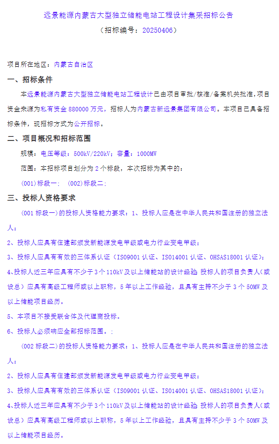 中國儲能網(wǎng)訊:4月7日,遠(yuǎn)景能源發(fā)布內(nèi)蒙古大型獨(dú)立儲能電站工程設(shè)計(jì)集采招標(biāo)公告。項(xiàng)目資金來源為私有資金880000萬元,折合總投資單價(jià)1.1元/Wh,招標(biāo)人為內(nèi)蒙古新遠(yuǎn)景集團(tuán)有限公司。