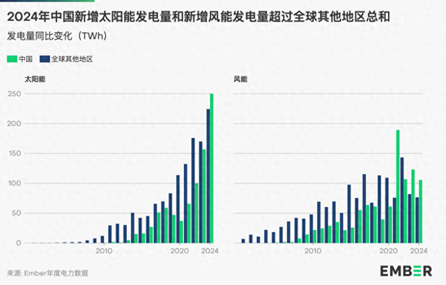 全球能源轉(zhuǎn)型過(guò)程中,中國(guó)起到了關(guān)鍵推動(dòng)作用。2024年,中國(guó)新增太陽(yáng)能和風(fēng)能發(fā)電量分別占全球總量的53%與58%,遠(yuǎn)超其他地區(qū)總和。其中,太陽(yáng)能發(fā)電量占比全球達(dá)8.3%,是三年前2021年的一倍多。中國(guó)的清潔能源的增長(zhǎng)滿足了國(guó)內(nèi)81%的新增電力需求,遠(yuǎn)高于過(guò)去五年平均52%的水平。