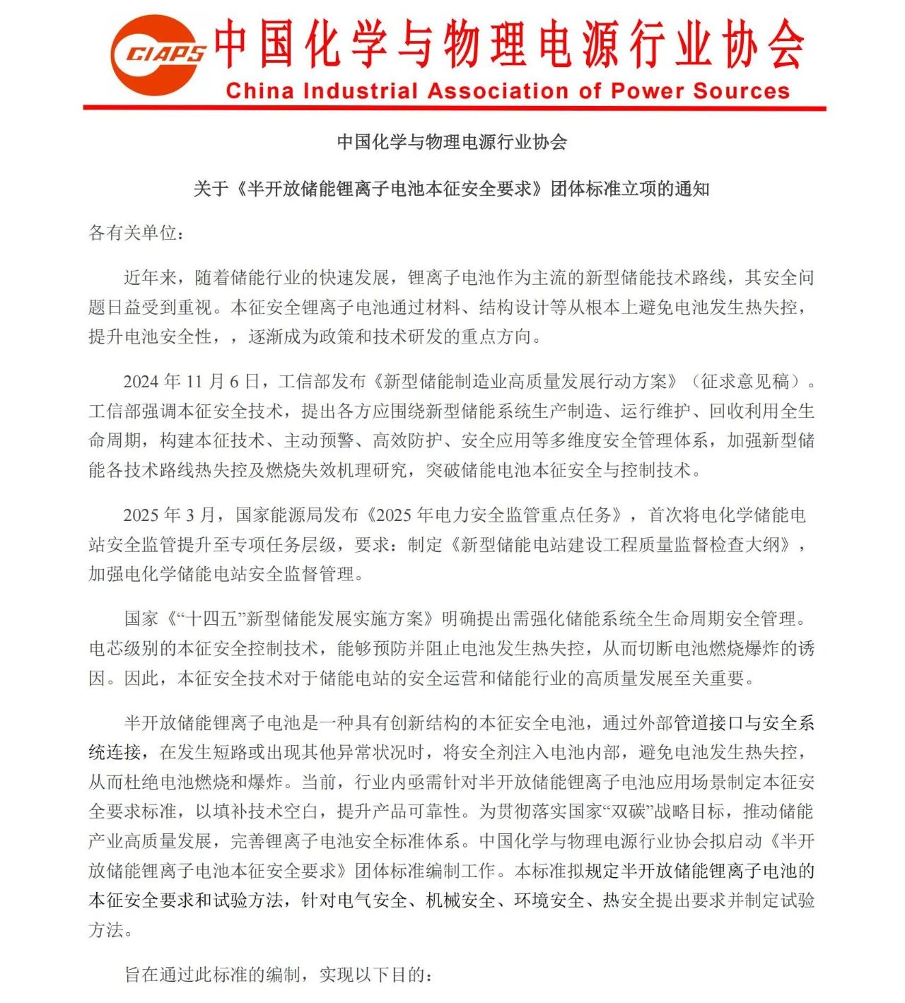 中國(guó)化學(xué)與物理電源行業(yè)協(xié)會(huì)關(guān)于《半開(kāi)放儲(chǔ)能鋰離子電池本征安全要求》團(tuán)體標(biāo)準(zhǔn)立項(xiàng)的通知