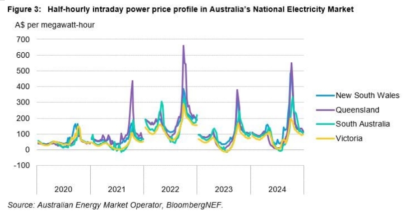 BNEF表示,電力市場(chǎng)的波動(dòng)性加劇為電池儲(chǔ)能系統(tǒng)通過(guò)低價(jià)時(shí)充電、高價(jià)時(shí)放電來(lái)套利的現(xiàn)貨市場(chǎng)批發(fā)價(jià)格創(chuàng)造了有利機(jī)會(huì)。該公司還發(fā)現(xiàn),2024年,澳大利亞國(guó)家電力市場(chǎng)中的大型電池儲(chǔ)能系統(tǒng)通過(guò)套利獲得了1.654億澳元(約合1.04億美元)收入,創(chuàng)歷史新高,與2023年的收入相比高出三倍多。