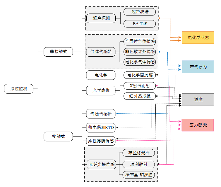 電化學(xué)儲(chǔ)能系統(tǒng)通過多層級(jí)管理架構(gòu)監(jiān)測(cè)表面溫度、電壓和電流等狀態(tài)變量,評(píng)估運(yùn)行狀態(tài),實(shí)現(xiàn)故障辨識(shí)。隨著原位在線監(jiān)測(cè)技術(shù)的發(fā)展,光纖和薄膜傳感方式在系統(tǒng)故障監(jiān)測(cè)中備受關(guān)注,一般分為非接觸式和接觸式。圖1為根據(jù)儲(chǔ)能系統(tǒng)運(yùn)行過程中多種狀態(tài)量響應(yīng)特性的原位監(jiān)測(cè)方法。