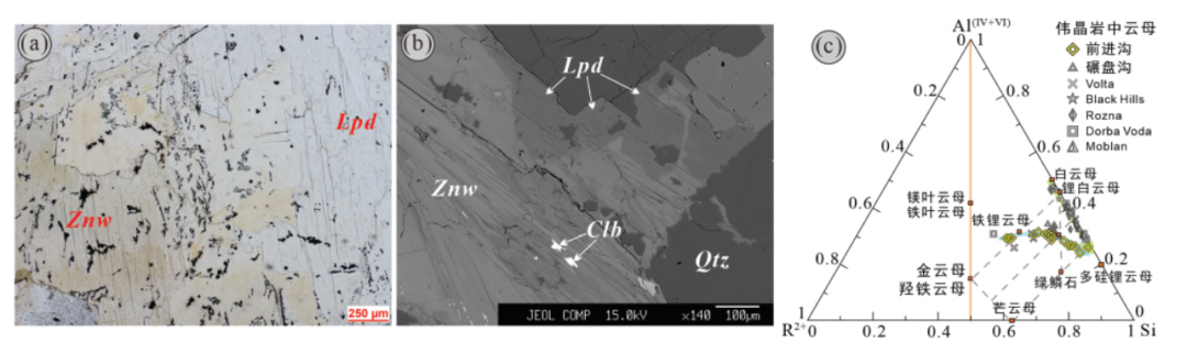 ( a) 光學(xué)顯微鏡照片; ( b) 背散射圖像, Clb-鈮鐵礦; ( c) 云母 Al( iv + vi) -R2 + -Si 成分分類圖解詳細(xì)數(shù)據(jù)見(jiàn)電子版附表 2