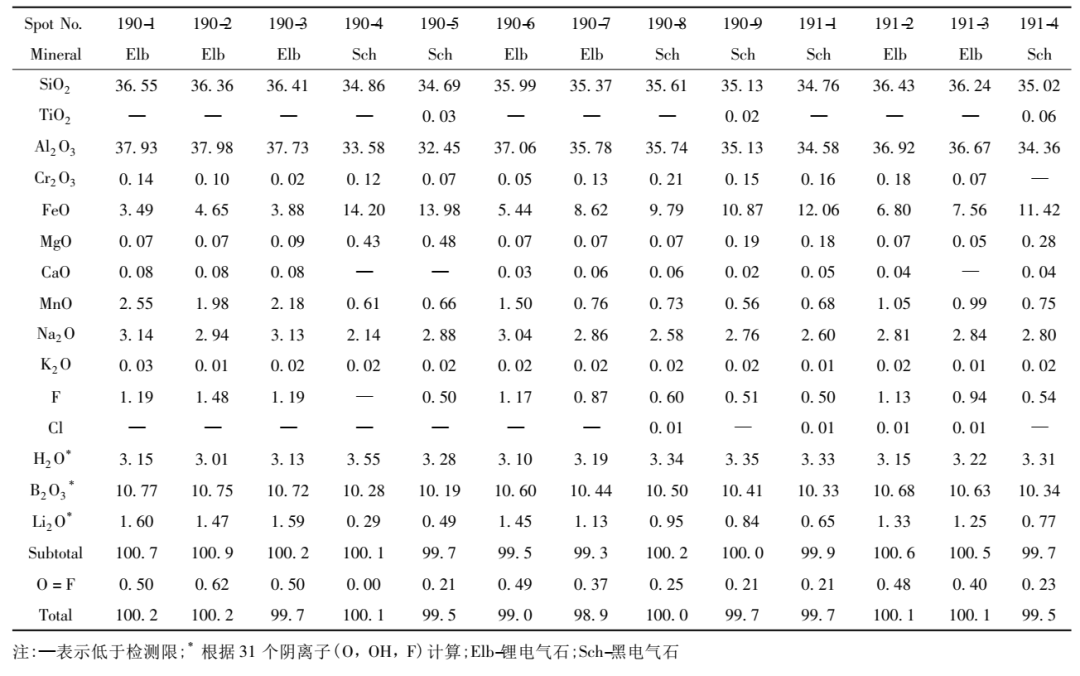 電氣石相較于云母顆粒較小,顆粒小于 3mm,手標(biāo)本上可以看到細(xì)小的柱狀晶形。在光學(xué)顯微鏡下,電氣石具有明顯多色性,黑電氣石呈現(xiàn)褐紅-淺褐黃色多色性,鋰電氣石呈現(xiàn)藍(lán)綠-淺藍(lán)綠的多色性,可見(jiàn)明顯的柱狀結(jié)構(gòu)( 圖 5a) 。鋰電氣石常分布在黑電氣石的邊緣( 核部為黑電氣石,邊緣為鋰電氣石; 圖 5a) 。背散射圖像下, 同樣觀察到很多極細(xì)小的鋰電氣石顆粒 ( 10 ~ 20μm; 圖 5b) 。根 據(jù) 電 子 探 針 分 析( EMPA) ,黑 電 氣 石 含 有 較 低 的 SiO2 含 量 ( 34. 7% ~35. 6% ) 、Al2O3 含量( 32. 5% ~ 35. 7% ) 、Li2 O 含量( 0. 3% ~1. 0% ) ,相對(duì)較高的 FeO 含量( 9. 8% ~ 14. 2% ) 、MgO 含量( 0. 1% ~ 0. 5% ) ; 鋰電氣石含有較高的 SiO2 含量( 35. 4% ~36. 6% ) 、Al2O3 含量( 35. 8% ~ 38. 0% ) 、Li2O 含量( 1. 1% ~1. 6% ) ,相對(duì)較低的 FeO 含量 ( 3. 5% ~ 8. 6% ) 、MgO 含量( < 0. 1% ) ( 表 3) 。