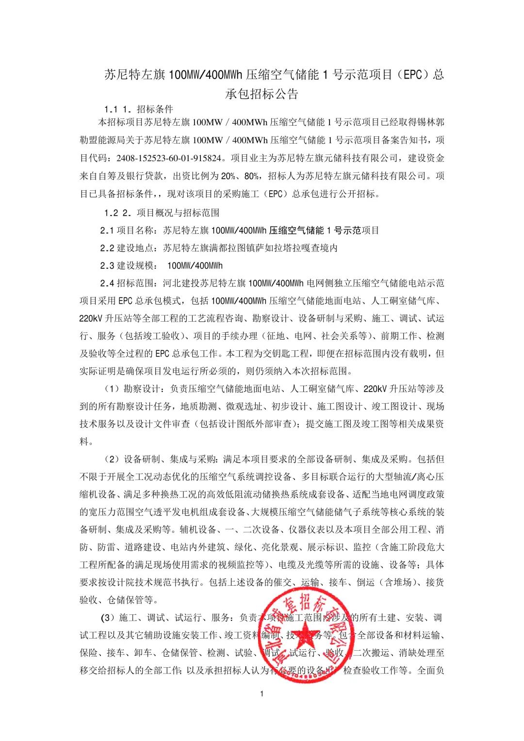 招標(biāo)范圍:河北建投蘇尼特左旗100MW/400MWh電網(wǎng)側(cè)獨(dú)立壓縮空氣儲(chǔ)能電站示范項(xiàng)目采用EPC總承包模式,包括100MW/400MWh壓縮空氣儲(chǔ)能地面電站、人工硐室儲(chǔ)氣庫、220kV升壓站等全部工程的工藝流程咨詢、勘察設(shè)計(jì)、設(shè)備研制與采購、施工、調(diào)試、試運(yùn)行、服務(wù)(包括竣工驗(yàn)收)、項(xiàng)目的手續(xù)辦理(征地、電網(wǎng)、社會(huì)關(guān)系等)、前期工作、檢測(cè)及驗(yàn)收等全過程的EPC總承包工作。本工程為交鑰匙工程,即便在招標(biāo)范圍內(nèi)沒有載明,但實(shí)際證明是確保項(xiàng)目發(fā)電運(yùn)行所必須的,則仍須納入本次招標(biāo)范圍。