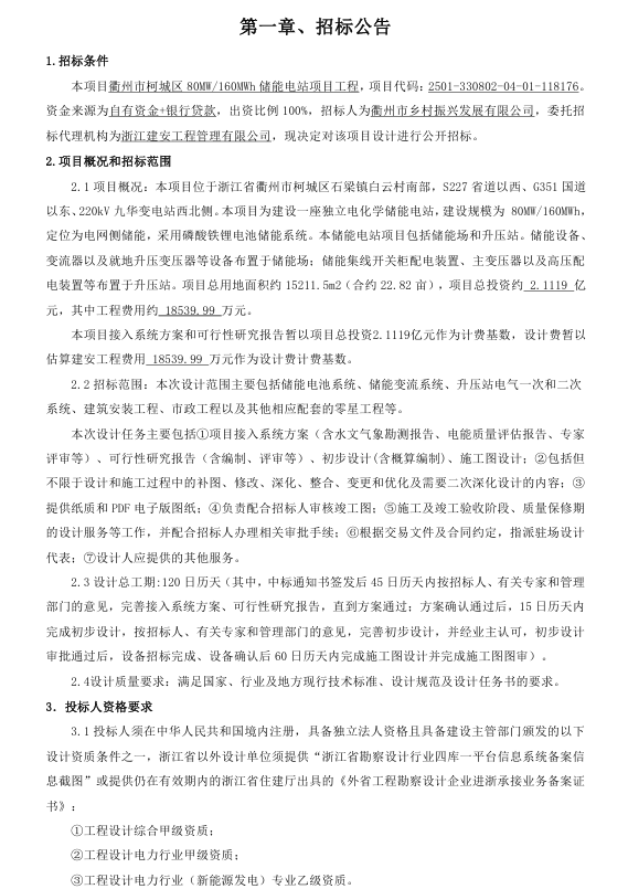 中國儲能網(wǎng)訊:4月17日,衢州市鄉(xiāng)村振興發(fā)展有限公司發(fā)布衢州市柯城區(qū)80MW/160MWh儲能電站項(xiàng)目工程設(shè)計招標(biāo),項(xiàng)目總投資約2.1119億元,約合1.32元/Wh。