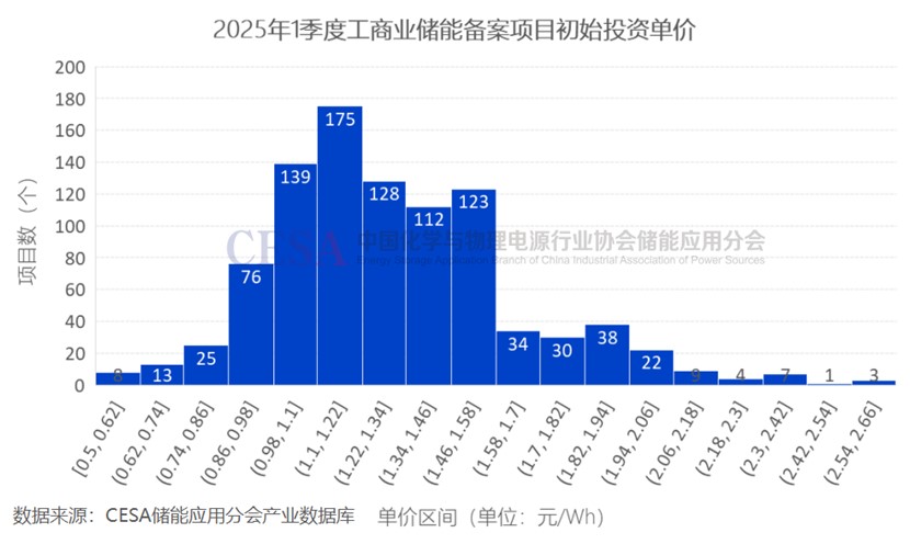 就初始單價分析,2025年第一季度單獨配置工商業(yè)儲能備案項目的初始投資單價主要集中在0.86-1.58元/Wh,77.55%的項目在這一區(qū)間內(nèi)。