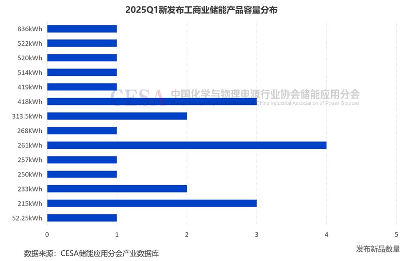 隨著工商業(yè)儲能單體大項目越來越多,外加土地資源緊張等因素,工商業(yè)儲能電池柜也朝著大型化發(fā)展。2025年1季度發(fā)布的23款明確規(guī)模的工商業(yè)儲能柜中,有8款容量在400kWh以上,超過三分之一,最大容量為2月東方日升在日本發(fā)布的eFlex 836kWh液冷儲能系統(tǒng)。此外,陽光電源、科陸電子、鵬輝能源都發(fā)布了超500kWh工商業(yè)儲能新產(chǎn)品。