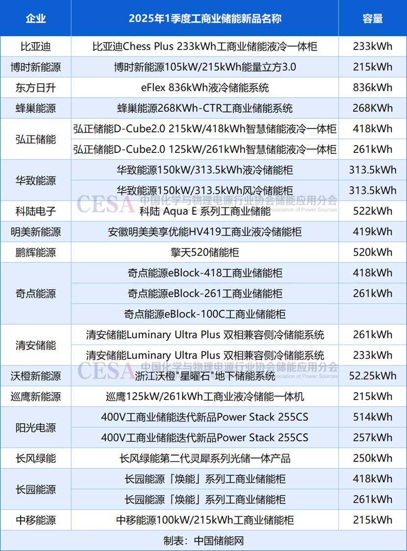 據(jù)CESA儲能應(yīng)用分會產(chǎn)業(yè)數(shù)據(jù)庫不完全統(tǒng)計,2025年1季度,比亞迪、陽光電源、弘正儲能、奇點能源、華致能源、中移能源、東方日升、清安儲能、長園能源等17家企業(yè)發(fā)布了24款工商業(yè)儲能柜。