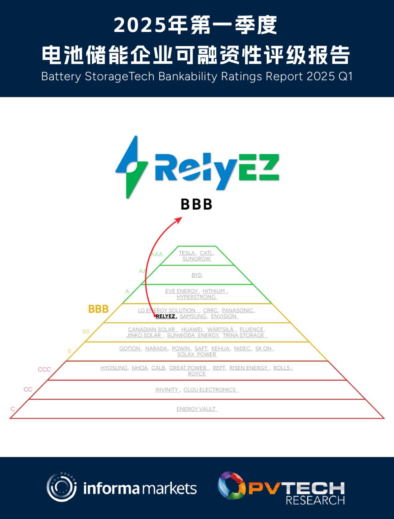中國儲能網(wǎng)訊:近日,國際權(quán)威研究機構(gòu)Informa Markets與PV Tech Research聯(lián)合發(fā)布了《2025第一季度儲能企業(yè)可融資性評級報告》。在這份備受矚目的全球榜單中,遠信儲能(RelyEZ)憑借其卓越表現(xiàn),成功斬獲BBB評級。這一評級不僅是對遠信儲能技術硬實力和穩(wěn)健財務狀況的高度肯定,也再次印證了其在全球市場的金融信譽與項目可靠性獲得了國際權(quán)威認可。