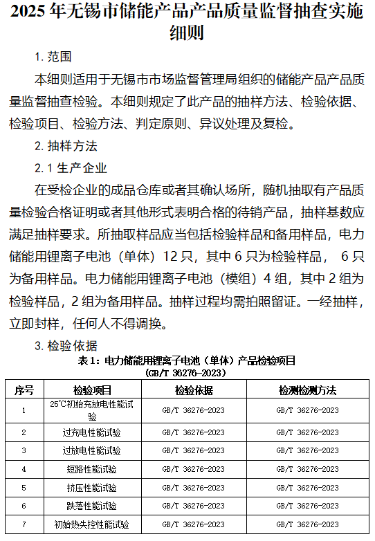 中國儲能網(wǎng)訊:4月21日,江蘇無錫市市場監(jiān)督管理局發(fā)布《2025年無錫市儲能產(chǎn)品產(chǎn)品質(zhì)量監(jiān)督抽查實施細則》。