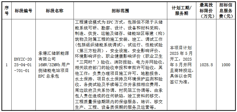 承德匯儲(chǔ)新能源有限公司 16MW/32MWh用戶側(cè)儲(chǔ)能電站項(xiàng)目EPC總承包招標(biāo)公告