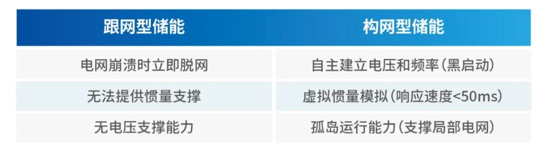 在電網(wǎng)支撐能力方面,傳統(tǒng)跟網(wǎng)儲(chǔ)能依賴電網(wǎng)指令行動(dòng),斷電時(shí)只能被動(dòng)退出。構(gòu)網(wǎng)儲(chǔ)能則能自主建立電壓和頻率,在電網(wǎng)崩潰時(shí)快速“重建秩序”。