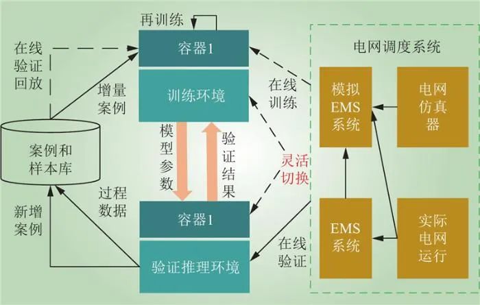 3)可靈活支持開發(fā)訓練、驗證推理環(huán)境需求,以及離線、仿真在線、運行系統(tǒng)在線驗證模式。訓練環(huán)境和推理環(huán)境無本質不同,只是前者要求的配置較完整,以提供全過程支持,后者則可輕量化部署,側重于以(接近)實際場景獲取AI模型的功能、性能驗證數(shù)據(jù)。對于類似在線驗證的需求,可通過引入電網仿真器、接入在線運行系統(tǒng)等方式實現(xiàn)。
