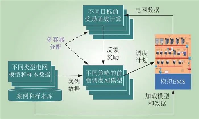 1)解耦了樣本數(shù)據(jù)與AI模型的關聯(lián)性。所有案例都來自統(tǒng)一的案例樣本庫,只是根據(jù)需求分別進行了抽取和再組織。2)適應了AI模型對框架的依賴。對不同的AI開發(fā)框架,能夠直接在平臺上或者基于鏡像的容器環(huán)境中得到支持。3)能夠輸入多種電網拓撲、發(fā)用電曲線、災害事件場景案例,對AI模型的訓練、驗證和遷移學習提供充分支撐。4)通過不同的容器化部署,能夠并行化進行各種機器學習算法、多種調度目標獎勵函數(shù)的驗證和比較。