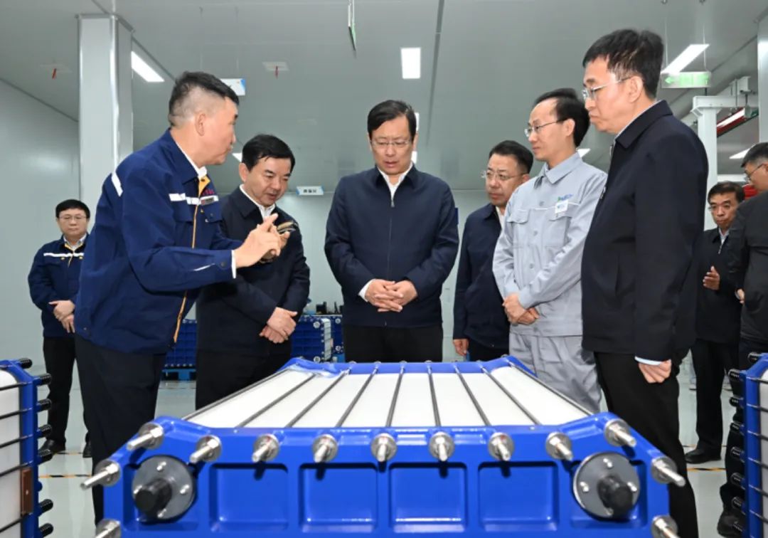 丁小強書記首先調(diào)研普能世紀(山西)新能源GW級電堆生產(chǎn)及系統(tǒng)集成項目,詳細了解全釩液流儲能電池的技術優(yōu)勢、生產(chǎn)工藝流程及市場應用前景。在參觀過程中,公司技術專家詳細介紹了全釩液流電池儲能系統(tǒng)的工作原理,其安全可靠、循環(huán)壽命長、可深度充放電、資源友好等特點引起丁小強書記的高度關注,這些優(yōu)勢使其在大規(guī)模儲能領域具有不可替代的作用,為新能源的穩(wěn)定消納和電網(wǎng)安全運行提供堅實保障。丁小強書記對全釩液流儲能技術賦能電網(wǎng)柔性調(diào)節(jié)的實踐成效給予高度認可。同時,就全釩液流儲能系統(tǒng)能量轉換效率提升、成本降低途徑等核心課題提出了期待與要求。