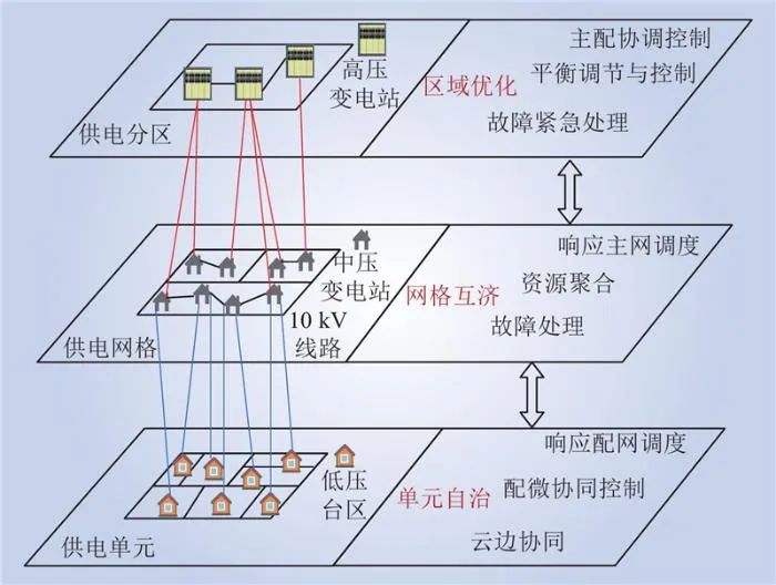 新型配電網(wǎng)從物理上劃分為區(qū)域、網(wǎng)格、臺(tái)區(qū)3層,形成“橫縱協(xié)同、分層分區(qū)”雙向協(xié)同調(diào)控,實(shí)現(xiàn)區(qū)域優(yōu)化、網(wǎng)格互濟(jì)、臺(tái)區(qū)自治的控制體系架構(gòu)如圖2所示,3層相互配合調(diào)度配電網(wǎng)全領(lǐng)域的電力管理。