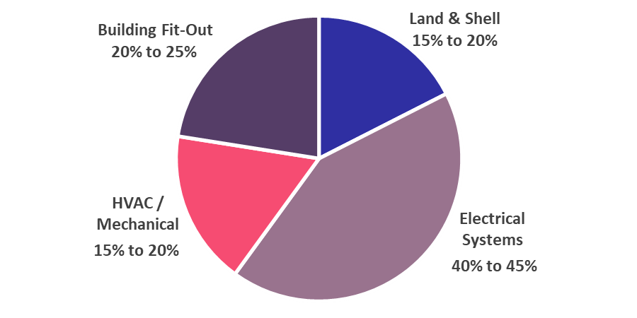 就配置完備的基礎(chǔ)建筑而言,土地成本在每平方英尺25美元到75美元之間,而建筑外殼成本在每平方英尺80美元到160美元之間。因此,配置完備的基礎(chǔ)建筑的總成本在每平方英尺105美元至235美元之間,相當(dāng)于總開發(fā)成本的17%至21%。