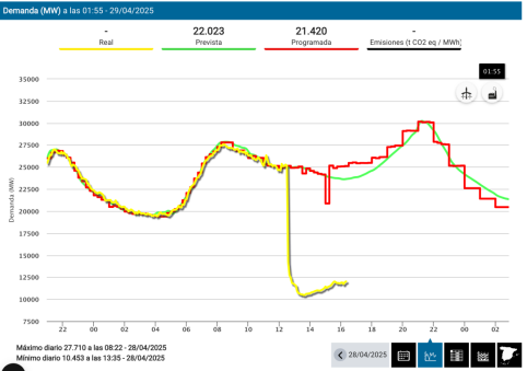 西班牙國家電網(wǎng)公司Red Eléctrica官網(wǎng)的運行數(shù)據(jù)顯示,當天中午十二點半左右,西班牙電網(wǎng)負荷從大約2500萬千瓦驟降至約1400萬千瓦,隨后一小時內(nèi)進一步下降至約1000萬千瓦,截至發(fā)稿,負荷緩慢恢復至約1200萬千瓦,仍有大量電力供應沒有恢復。