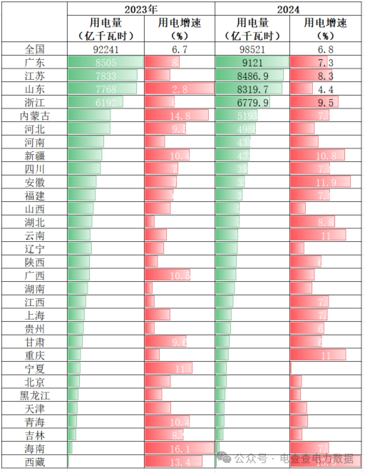 在31個(gè)省份中,各省份的用電量情況呈現(xiàn)出明顯的差異與特點(diǎn)。經(jīng)濟(jì)大省廣東、江蘇、山東和浙江不僅GDP總量位居前列,用電量也同樣名列前茅。以廣東為例,其2024年12月當(dāng)月用電量高達(dá)719億千瓦時(shí),全年累計(jì)用電量更是達(dá)到9121億千瓦時(shí),同比增長(zhǎng)7.3%,顯示出強(qiáng)大的經(jīng)濟(jì)活力與能源需求。部分省份的用電量增速尤為亮眼。如安徽,12月當(dāng)月用電量319.9億千瓦時(shí),同比增長(zhǎng)4.2%,全年累計(jì)用電量3597.9億千瓦時(shí),同比增長(zhǎng)高達(dá)11.9%,反映出該省經(jīng)濟(jì)的快速發(fā)展與產(chǎn)業(yè)結(jié)構(gòu)的持續(xù)優(yōu)化。同樣,重慶12月當(dāng)月用電量136.6億千瓦時(shí),同比增長(zhǎng)6.4%,全年累計(jì)用電量1612.6億千瓦時(shí),同比增長(zhǎng)11.0%,展現(xiàn)出強(qiáng)勁的發(fā)展勢(shì)頭。也有一些省份的用電量增長(zhǎng)相對(duì)較為平穩(wěn)。北京12月當(dāng)月用電量140.4億千瓦時(shí),同比下降6.1%,但全年累計(jì)用電量1389.4億千瓦時(shí),同比增長(zhǎng)2.3%,這或許與城市的產(chǎn)業(yè)結(jié)構(gòu)調(diào)整與能源效率提升有關(guān)。上海12月當(dāng)月用電量173.2億千瓦時(shí),同比增長(zhǎng)2.7%,全年累計(jì)用電量1984.2億千瓦時(shí),同比增長(zhǎng)7.3%,作為國(guó)際化大都市,其用電量的增長(zhǎng)與金融、服務(wù)業(yè)等產(chǎn)業(yè)的穩(wěn)定發(fā)展相契合。值得注意的是,西藏、云南等省份的用電量增速也較為突出。西藏12月當(dāng)月用電量16.2億千瓦時(shí),同比增長(zhǎng)10.3%,全年累計(jì)用電量154.2億千瓦時(shí),同比增長(zhǎng)13.9%;云南12月當(dāng)月用電量247.3億千瓦時(shí),同比增長(zhǎng)11.4%,全年累計(jì)用電量2788.3億千瓦時(shí),同比增長(zhǎng)11.0%。這些地區(qū)用電量的快速增長(zhǎng),不僅體現(xiàn)了當(dāng)?shù)亟?jīng)濟(jì)的加速發(fā)展,也與基礎(chǔ)設(shè)施建設(shè)的推進(jìn)、產(chǎn)業(yè)轉(zhuǎn)移的承接等因素密切相關(guān)。總體而言,2024年全國(guó)及31省全社會(huì)用電量的增長(zhǎng),既反映了我國(guó)經(jīng)濟(jì)的整體向好,也展現(xiàn)了各省份在不同產(chǎn)業(yè)發(fā)展路徑下的能源需求特征。未來(lái),隨著經(jīng)濟(jì)結(jié)構(gòu)的進(jìn)一步調(diào)整與能源轉(zhuǎn)型的深入推進(jìn),全社會(huì)用電量的增長(zhǎng)態(tài)勢(shì)與分布格局或?qū)l(fā)生新的變化,值得持續(xù)關(guān)注與深入研究。