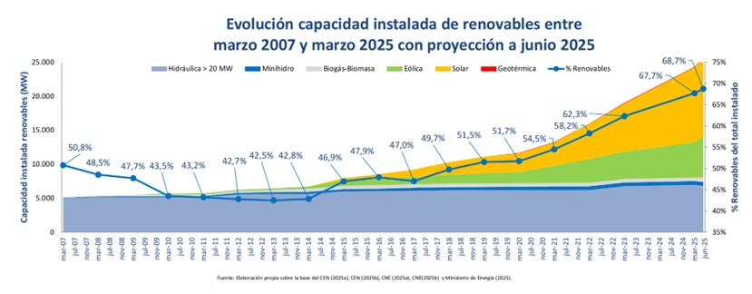 智利能源部報(bào)告數(shù)據(jù)顯示,截至2025年3月底,智利發(fā)電設(shè)施凈裝機(jī)容量達(dá)35.927GW。目前,可再生能源裝機(jī)占比達(dá)到68%,其中光伏、風(fēng)電等非傳統(tǒng)可再生能源裝機(jī)占比達(dá)48%。