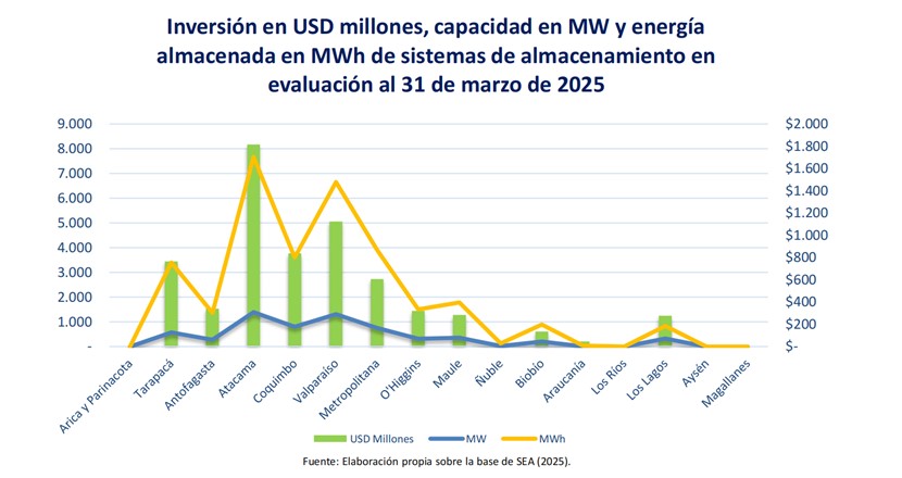 截至2025年3月31日,智利全國范圍內(nèi)共37個(gè)儲能項(xiàng)目正在接受智利環(huán)境影響評估局(SEIA)的環(huán)境評估,總規(guī)模高達(dá)6.321GW/31.768GWh,計(jì)劃總投資65.77億美元(折合人民幣478.41億元),阿塔卡馬和瓦爾帕萊索地區(qū)規(guī)模最大,投資最高。
