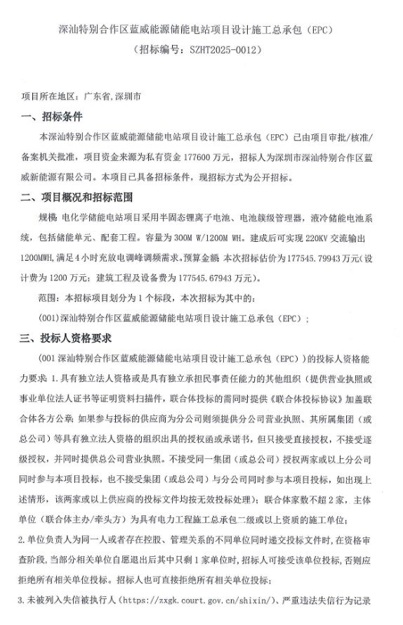 本招標(biāo)項(xiàng)目劃分為1個(gè)標(biāo)段,本次招標(biāo)為其中的(001)深汕特別合作區(qū)藍(lán)威能源儲(chǔ)能電站項(xiàng)目設(shè)計(jì)施工總承包(EPC)。