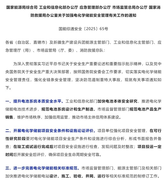 中國儲能網(wǎng)訊:5月7日,國家能源局網(wǎng)站發(fā)布了《關于加強電化學儲能安全管理有關工作的通知》,從電池系統(tǒng)本質(zhì)安全、項目論證評價、標準規(guī)范完善、監(jiān)管責任落實、部門聯(lián)動機制到企業(yè)主體責任,六大維度勾勒出中國電化學儲能安全管理的升級路徑。