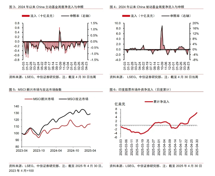 ▍中國(guó)A股市場(chǎng)之外的其他新興市場(chǎng)方面,2025年3月-4月,新興市場(chǎng)整體承壓,其中受關(guān)稅影響較大的新興市場(chǎng)資金持續(xù)流出,而印度和印尼則因自身經(jīng)濟(jì)結(jié)構(gòu)而保持韌性。