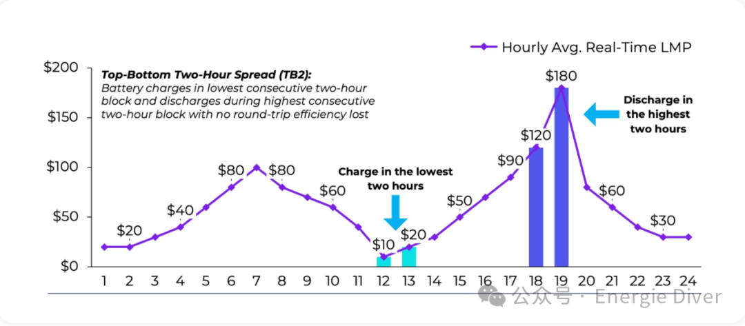 為此,我們按持續(xù)時(shí)間對(duì)電池分組,然后按持續(xù)時(shí)間計(jì)算實(shí)時(shí)上下價(jià)差。下圖展示了一個(gè)2小時(shí)儲(chǔ)能系統(tǒng)的概念,其中線上點(diǎn)表示小時(shí)平均實(shí)時(shí)(RT)價(jià)格,柱狀圖分別顯示在最高和最低小時(shí)價(jià)格期間充電成本和放電收入。
