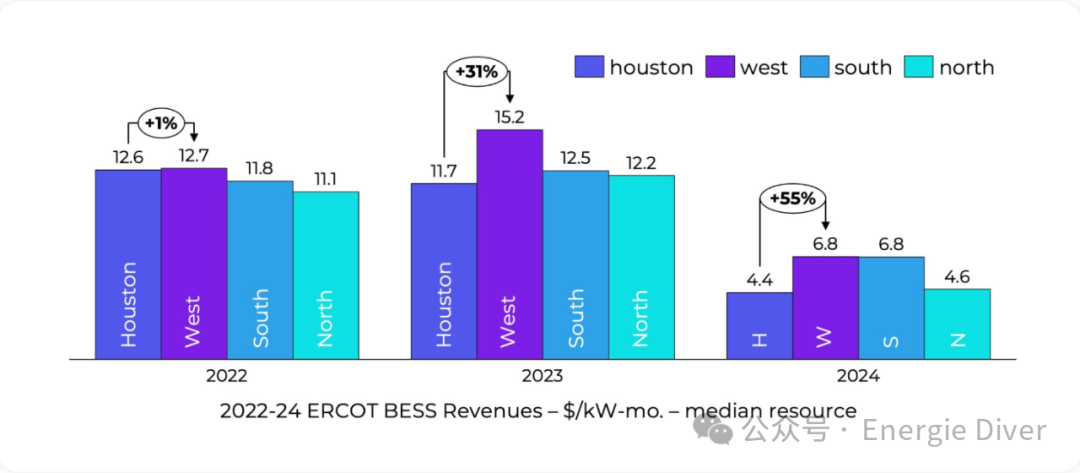 此基線存在一些局限性。儲(chǔ)能根據(jù)其當(dāng)前估計(jì)的能量容量分為1小時(shí)或2小時(shí)持續(xù)時(shí)間組。此外,基線未考慮輔助服務(wù)、日前市場(chǎng)或效率損失。然而,隨著實(shí)時(shí)能源套利在電池收入結(jié)構(gòu)中占比越來越大,我們認(rèn)為上下價(jià)差是最有意義的基準(zhǔn)。由于ERCOT中BESS能源收入的絕大多數(shù)來自實(shí)時(shí)能源市場(chǎng),我們認(rèn)為這是最有意義的基準(zhǔn)。