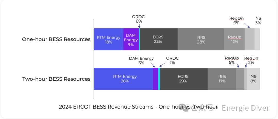 此圖顯示了1小時(shí)和2小時(shí)電池之間的策略差異。在1小時(shí)電池中,系統(tǒng)收入中不到30%來自能源套利,而在2小時(shí)電池中,超過40%的收入來自能源套利。
