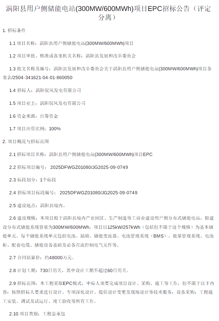 中國(guó)儲(chǔ)能網(wǎng)訊:5月13日,中國(guó)招投標(biāo)公共服務(wù)平臺(tái)發(fā)布安徽亳州渦陽(yáng)縣300MW/600MWh用戶(hù)側(cè)儲(chǔ)能電站EPC招標(biāo)公告,項(xiàng)目招標(biāo)人為渦陽(yáng)馭風(fēng)發(fā)電有限公司,資金來(lái)源為自籌資金。