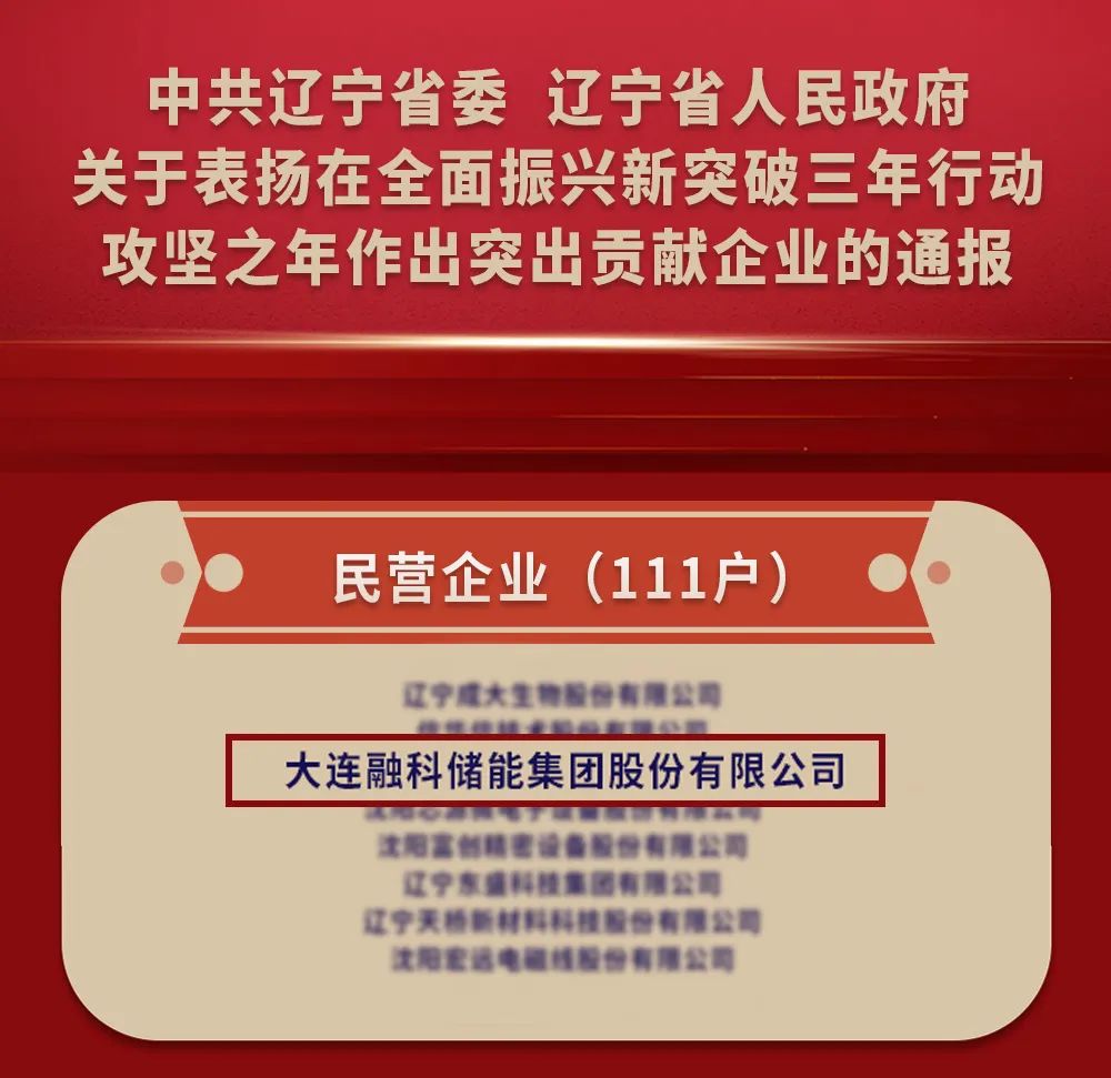 此次大會,規(guī)格之高、規(guī)模之大,盡顯遼寧省推動企業(yè)高質(zhì)量發(fā)展的堅定決心。遼寧省委書記、省人大常委會主任郝鵬親臨現(xiàn)場并發(fā)表重要講話,遼寧省委副書記、省長王新偉主持會議,各界目光聚焦于此。大會現(xiàn)場,省委常委、組織部部長蔣天寶宣讀了省委、省政府《關(guān)于表揚在全面振興新突破三年行動攻堅之年作出突出貢獻企業(yè)的通報》,融科儲能在一眾國企、民企、外企和金融機構(gòu)中脫穎而出,與其他 240家優(yōu)秀企業(yè)一同受到通報表揚。