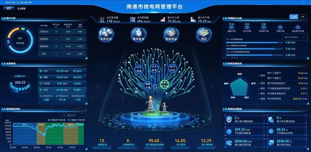 2025年4月中旬,國(guó)網(wǎng)南通供電公司承建的南通市微電網(wǎng)管理平臺(tái)正式上線運(yùn)行,在電網(wǎng)側(cè)可實(shí)現(xiàn)對(duì)全市微電網(wǎng)用戶的發(fā)展、資源規(guī)模進(jìn)行監(jiān)測(cè),且能實(shí)時(shí)分析最大上調(diào)、下調(diào)能力,評(píng)估新能源消納率、自平衡率等運(yùn)營(yíng)效益,這也是全省首個(gè)覆蓋“源網(wǎng)荷儲(chǔ)碳”全鏈條的市級(jí)微電網(wǎng)管理平臺(tái)。