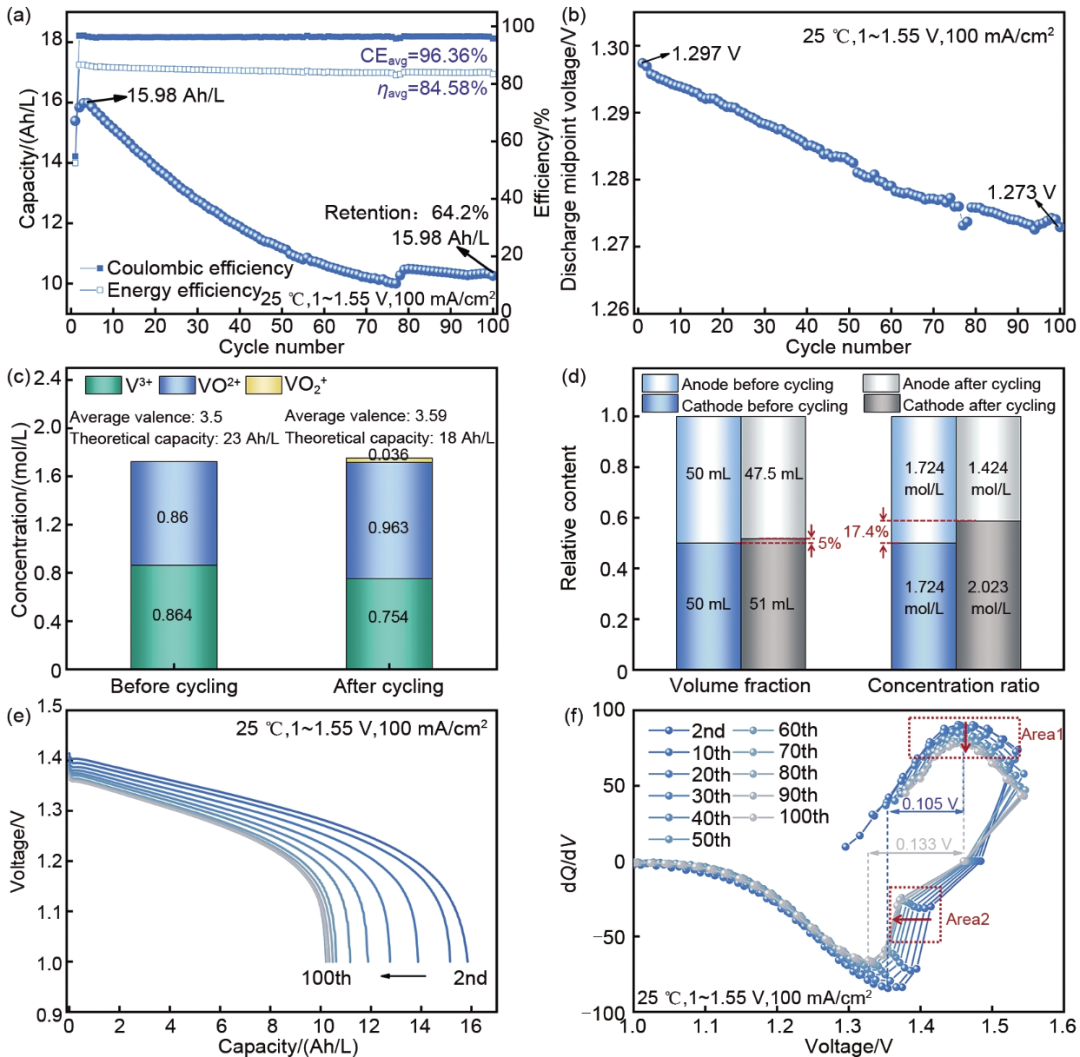 圖1 (a) 原廠電解液循環(huán)100圈的放電比容量、庫侖效率CE和能量效率η;(b) 放電中值電壓曲線;(c) 循環(huán)前后電解液的組成對比;(d) 循環(huán)前后正負(fù)極電解液體積和濃度對比;(e) 第2圈及每10圈的放電曲線;(f) 微分電容曲線