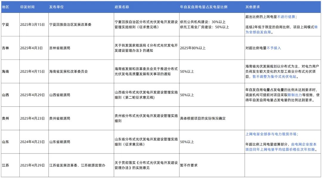山西、遼寧、山東、廣西、海南等省(區(qū))提出,采用自發(fā)自用余電上網(wǎng)模式的一般工商業(yè)光伏,年自發(fā)自用電量比例應(yīng)在50%以上。其中,山東提出,一般工商業(yè)和大型工商業(yè)分布式光伏采用自發(fā)自用余電上網(wǎng)模式的,上網(wǎng)電量全部參與電力現(xiàn)貨市場(chǎng)。