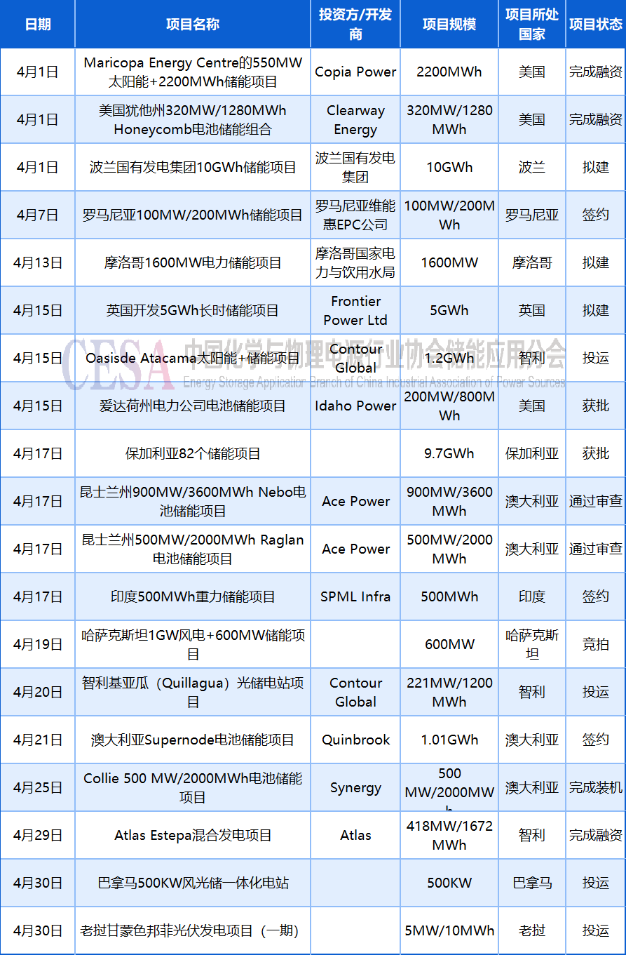 中國(guó)儲(chǔ)能網(wǎng)訊:2025年4月,CESA儲(chǔ)能應(yīng)用分會(huì)產(chǎn)業(yè)數(shù)據(jù)庫追蹤到18起海外儲(chǔ)能項(xiàng)目建設(shè)動(dòng)態(tài)事件,總規(guī)模超43.97GWh,涉及Contour Global、Ace Power、Ace Power、Frontier Power Ltd、SPML Infra、Copia Power、Clearway Energy、摩洛哥國(guó)家電力與飲用水局、波蘭國(guó)有發(fā)電集團(tuán)、Atlas等全球能源投資方/開發(fā)商,建設(shè)地點(diǎn)位于保加利亞、智利、澳大利亞、英國(guó)、印度、美國(guó)、摩洛哥、波蘭、智利等國(guó)家。
