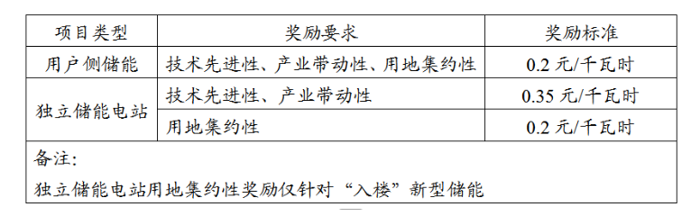 根據(jù)實(shí)際放電量給予獎(jiǎng)勵(lì)。具備技術(shù)先進(jìn)性、產(chǎn)業(yè)帶動(dòng)性、用地集約性的用戶側(cè)儲(chǔ)能:0.2元/千瓦時(shí)。具備技術(shù)先進(jìn)性、產(chǎn)業(yè)帶動(dòng)性的獨(dú)立儲(chǔ)能電站:0.35元/千瓦時(shí)。具備技術(shù)先進(jìn)性、產(chǎn)業(yè)帶動(dòng)性、用地集約性的獨(dú)立儲(chǔ)能電站:對(duì)“入樓”部分儲(chǔ)能電池額外獎(jiǎng)勵(lì)0.2元/千瓦時(shí)。每千瓦時(shí)儲(chǔ)能容量的年電量獎(jiǎng)勵(lì)上限600千瓦時(shí),獎(jiǎng)勵(lì)期3年。