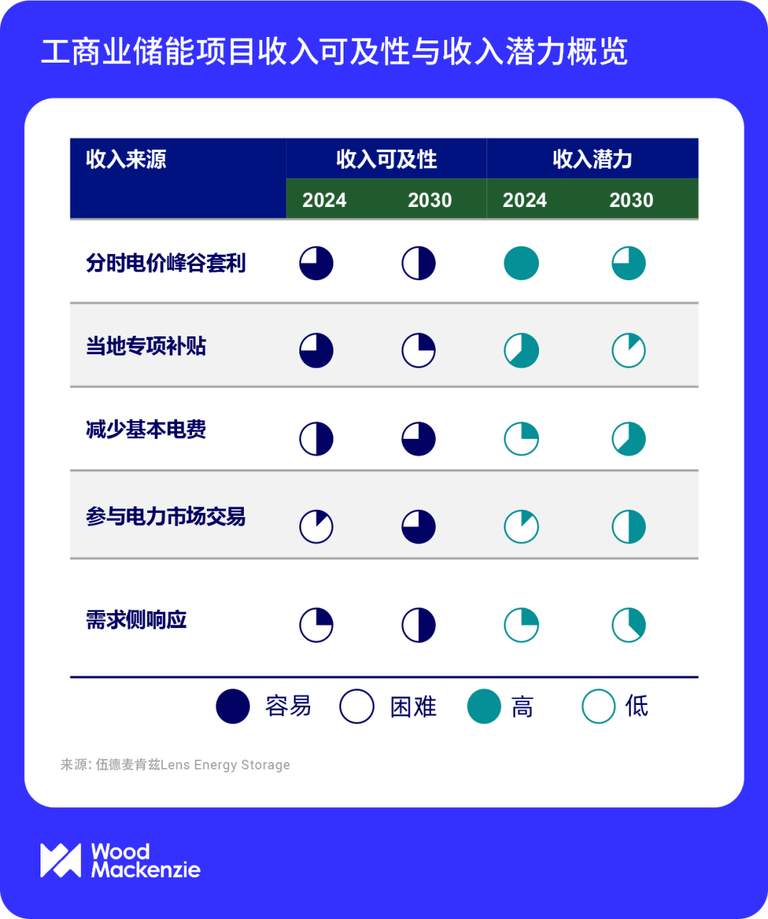 目前,工商業(yè)儲(chǔ)能項(xiàng)目的收入來(lái)源主要來(lái)自于以下五個(gè)渠道,包括分時(shí)電價(jià)峰谷套利、當(dāng)?shù)貙m?xiàng)補(bǔ)貼、減少基本電費(fèi)、參與需求側(cè)響應(yīng)和參與電力市場(chǎng)交易。伍德麥肯茲對(duì)項(xiàng)目收益的調(diào)研和測(cè)算顯示:在2024年,分時(shí)電價(jià)峰谷套利和當(dāng)?shù)貙m?xiàng)補(bǔ)貼是最主要的兩大收入來(lái)源,貢獻(xiàn)了約90%的首年收入,且在全生命周期中占比高達(dá)40%。在項(xiàng)目運(yùn)營(yíng)早期優(yōu)先保障這兩項(xiàng)收入來(lái)源是快速回收投資的關(guān)鍵策略。