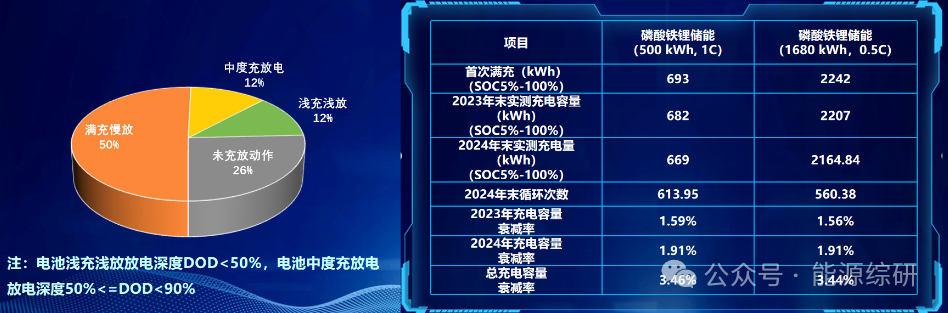 2024全年磷酸鐵鋰儲能充放電271次,其中滿充滿放運行184天,占比50.41%;淺充淺放44次,占比12.05%;陰天因素導(dǎo)致儲能未動作94天,占比25.75%。