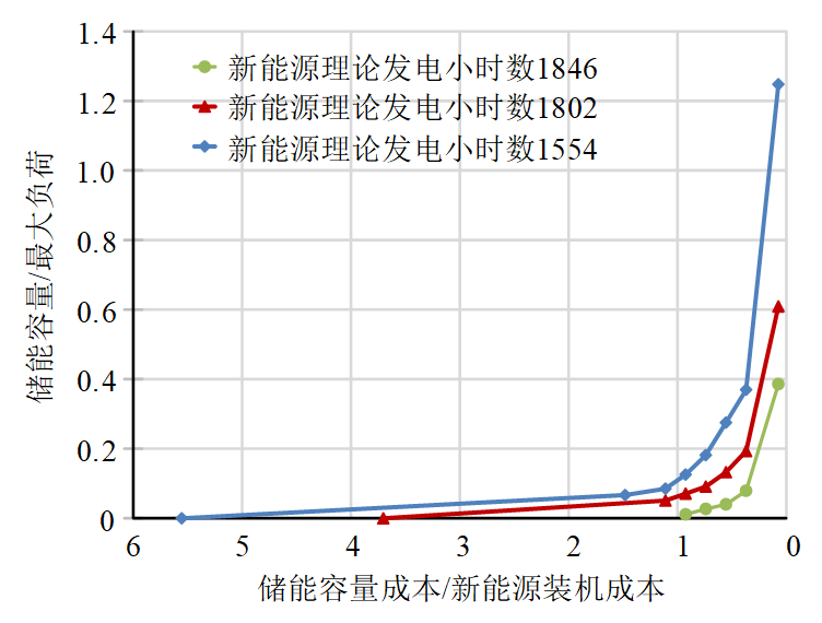 隨著新能源裝機(jī)占比的持續(xù)增加,新能源利用率持續(xù)下降,合理優(yōu)化配置儲能是提升新能源利用率的重要手段。研究發(fā)現(xiàn):儲能配置規(guī)模取決于儲能與新能源成本的比值、新能源理論發(fā)電小時數(shù)、新能源發(fā)電量占比。儲能與新能源成本比值越小、新能源理論發(fā)電小時數(shù)越小、新能源發(fā)電量占比越低,儲能配置規(guī)模越大(圖2和圖3)。但隨著儲能配置規(guī)模的增加,減少1kW新能源裝機(jī)所需的儲能容量逐漸增大,即增配儲能的作用呈邊際遞減效應(yīng)(圖4)。