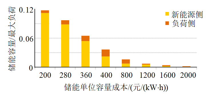 ①儲能對網(wǎng)內(nèi)輸電線路的優(yōu)化作用。新能源發(fā)電量占比較低時,儲能集中配置在新能源側(cè)平抑新能源出力波動;新能源發(fā)電量占比較高時,儲能優(yōu)先配置在負(fù)荷側(cè)進(jìn)行削峰填谷,且隨著儲能單位造價降低,新能源側(cè)的儲能配置規(guī)模隨之增加;常規(guī)電源側(cè)無需配置儲能。(圖10)