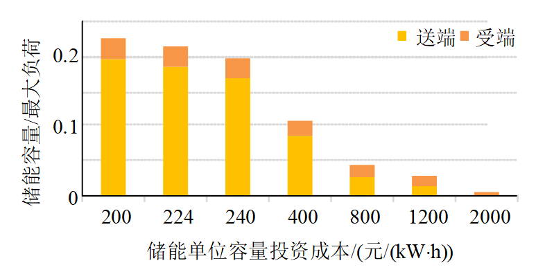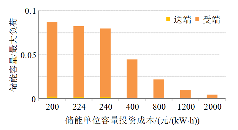 ②儲能對基地外送直流線路的優(yōu)化作用。新能源發(fā)電量占比較低時,儲能主要配置在受端,降低負(fù)荷峰谷差;新能源發(fā)電量占比較高時,儲能主要配置在送端,平抑新能源波動的同時促進(jìn)新能源消納(圖11)。