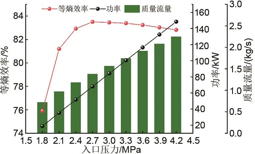 二氧化碳儲能系統(tǒng)運(yùn)行工況的變化,會引起透平的運(yùn)行參數(shù)偏離設(shè)計值。為保證儲能系統(tǒng)的穩(wěn)定運(yùn)行,需要對CO2向心透平在非設(shè)計工況下的性能進(jìn)行分析。CO2向心透平變工況分析主要包括變?nèi)肟趬毫?、變?nèi)肟跍囟群妥冝D(zhuǎn)速,其中變?nèi)肟趬毫τ贑O2向心透平的質(zhì)量流量和輸出功率影響較大,且向心透平入口壓力主要通過影響質(zhì)量流量的變化來影響輸出功率。因此本文保持其他邊界條件不變,改變透平入口壓力,分析其對該CO2向心透平性能的影響。該CO2向心透平在入口壓力低于1.7 MPa或高于12 MPa時,模擬結(jié)果不收斂,且變工況分析通常取偏離設(shè)計工況±50%的范圍,因此入口壓力的變化范圍取為1.8~4.2 MPa。入口壓力對于透平性能的影響如圖8所示,當(dāng)入口壓力由1.8 MPa變化到4.2 MPa時,該CO2向心透平的等熵效率先增加后減小,在設(shè)計點(diǎn)附近達(dá)到最大等熵效率83.51%。對于每個向心透平,存在一個最佳的特性比,當(dāng)入口壓力變化時,特性比偏離最佳值,導(dǎo)致透平等熵效率降低。對于CO2向心透平,更關(guān)注其在偏離設(shè)計工況±20%范圍內(nèi)的性能變化。該CO2向心透平在偏離設(shè)計工況20%(0.6 MPa)的范圍內(nèi),透平的等熵效率高于82%,表明該透平的變工況性能較好。