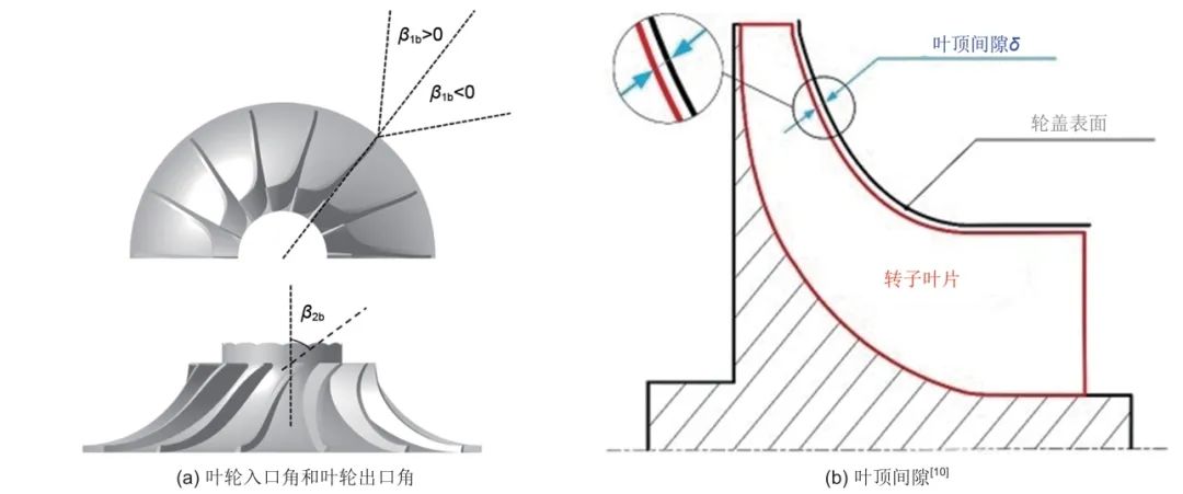 圖9 葉輪入口角、葉輪出口角 (a) 和葉頂間隙 (b) 示意圖