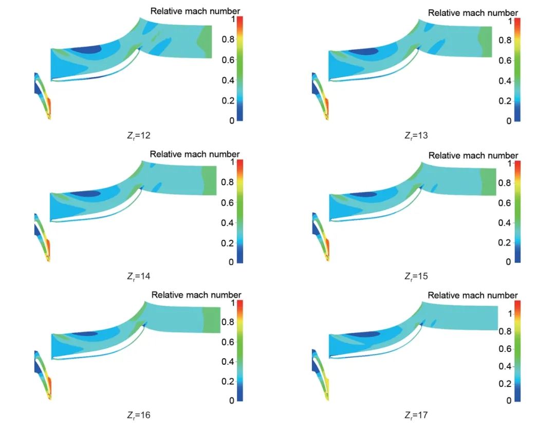 圖10 不同葉片數(shù)下透平相對馬赫數(shù)分布