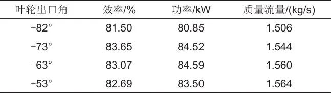 葉輪出口角決定了工質(zhì)的膨脹流動和出口速度大小,合適的葉輪出口角可以降低流動分離。葉輪入口角取為-10°,改變?nèi)~輪出口角,分析其對透平性能的影響。葉輪出口角的初始值為-63°,考慮葉片幾何結(jié)構(gòu)的限制,葉輪出口角度最大值約為-82°。因此選取-53°、-73°、-82°三組作為對照。